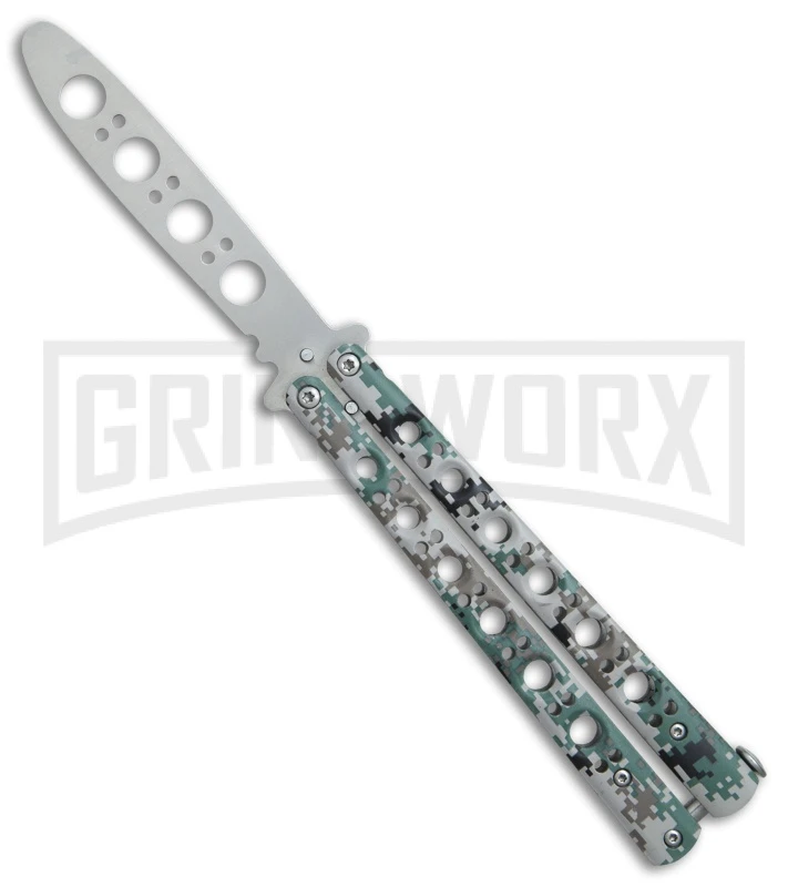 This Camo Fly Butterfly Trainer has a stainless steel handle with a green digi-camo finish and a satin finished trainer blade.