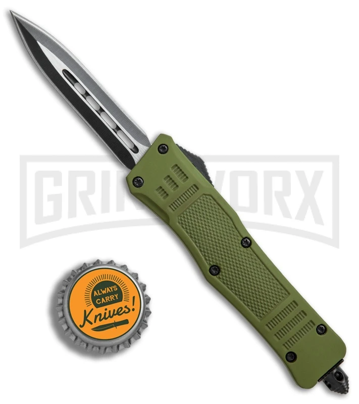 This Mini Defender model has a two-tone dagger blade with a plain edges and an OD green handle.