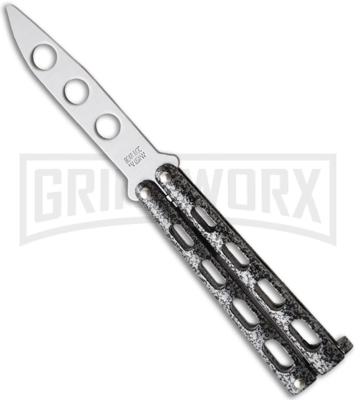 Bear Cutlery small butterfly knife trainer. The knife features a tough epoxy powder coating over zinc handles, which have been skeletonized to reduce weight. Stainless steel blade with dull edges. Durable tang pin construction. A nice USA made budget butterfly knife.