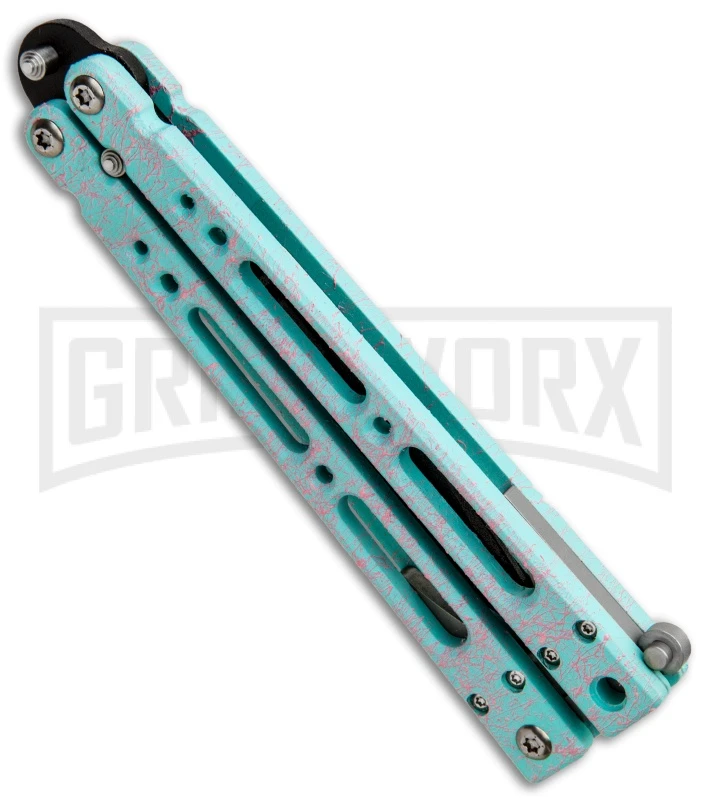 Collaboration between BladeRunnerS (BRS) and Bear OPS: the Bear Song IV butterfly knife. The B-400 flipper features teal and pink speckle finished aluminum handles with stainless steel spacers and a swappable latch. The pivots have 304 bearing surfaces and phosphorus bronze washers. The black powder coated 1095 steel point blade has a double tang pin design for great performance.