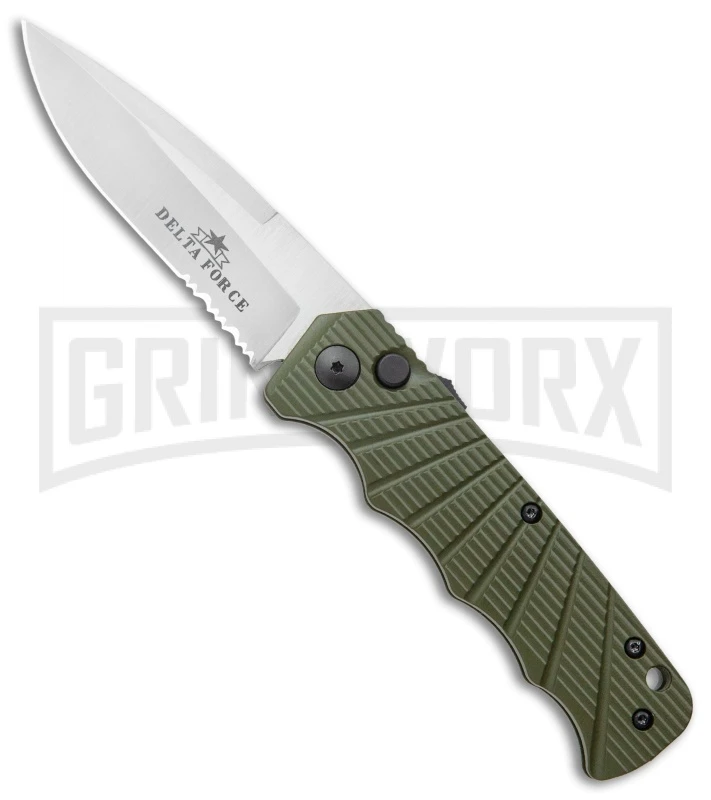 The Delta Force Automatic is a side-opening automatic that fires with authority. The handle is made from a sturdy aluminum and sports a deep carry pocket clip. There is a safety mechanism along the spine of the handle that allows you to lock the blade open or closed.