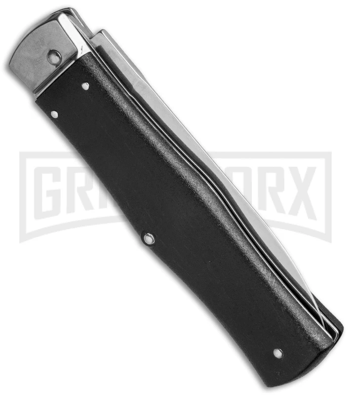 The Mikov automatic knives come from the Czech Republic. This model features black ABS scales and a dagger-style stainless blade (one side is sharp and the other is a false edge). The Mikov series is well-regarded for their “ready to work” no nonsense design. Rivet construction. The knife is opened using the small lever near the top of the knife. The lever rests flush in the handle when not in use.