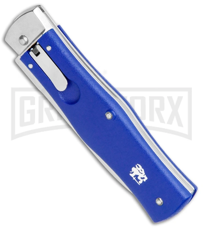 The Mikov automatic knives come from the Czech Republic. This model features blue ABS scales and a dagger-style stainless blade (one side is sharp and the other is a false edge). The Mikov series is well-regarded for their “ready to work” no nonsense design. Rivet construction. The knife is opened using the small lever near the top of the knife. The lever rests flush in the handle when not in use.