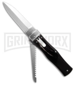 This Mikov Predator 241 has a satin dagger blade, a dark horn handle, a pocket clip, and an additional saw blade.