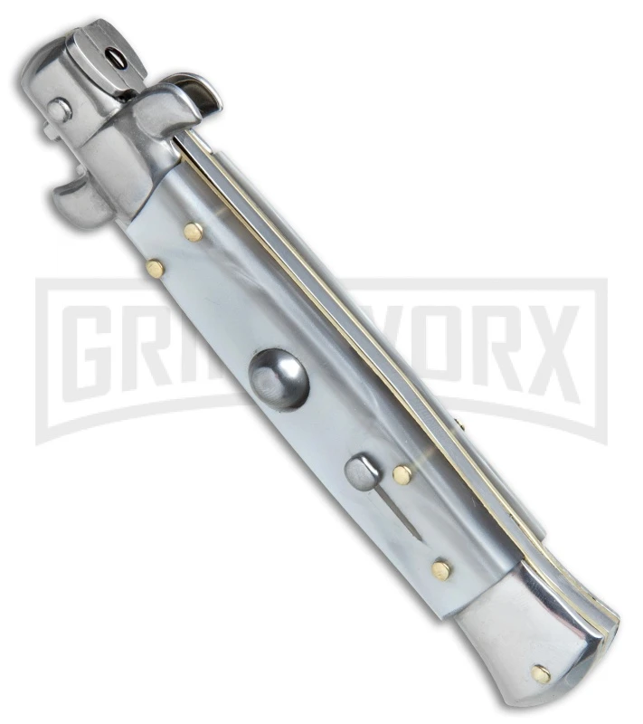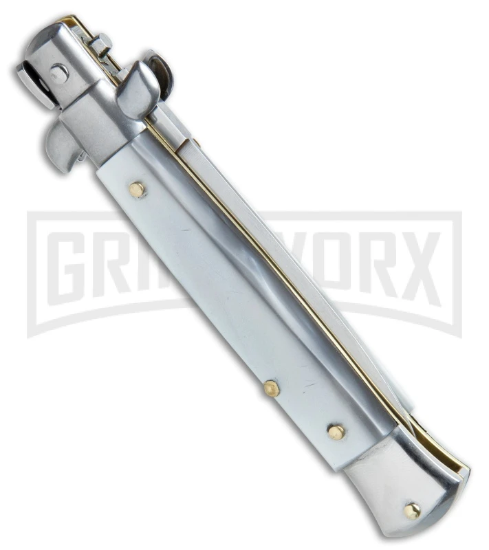 Frank B. 7.5″ Italian Stiletto White Pearlex Automatic Knife – Satin Bayonet