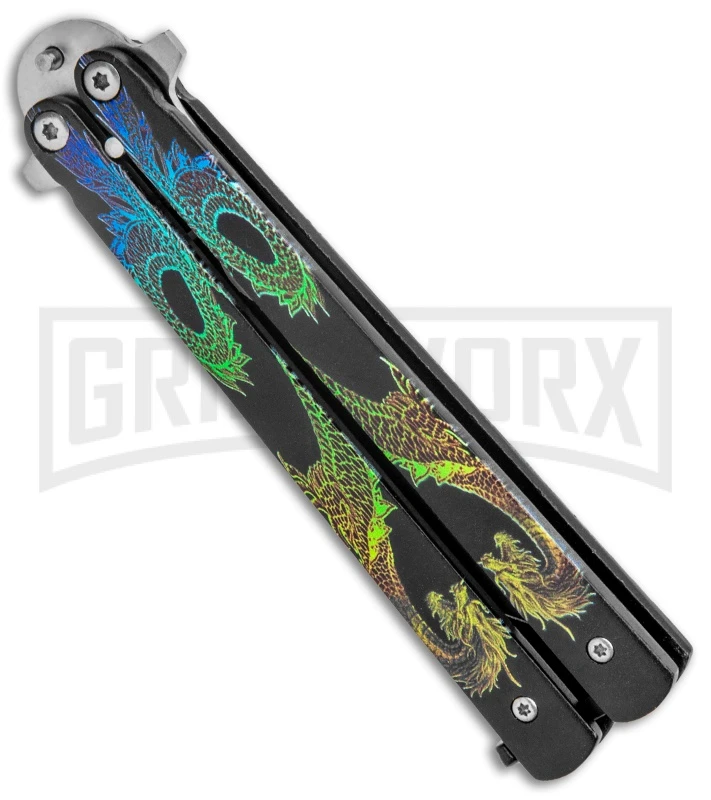 This butterfly knife has solid, lightweight action. It features black steel handles with dragon engravings. The 440C stainless steel, plain edge, tanto blade has two tang pins, which results in tighter lock-up and less blade wear.